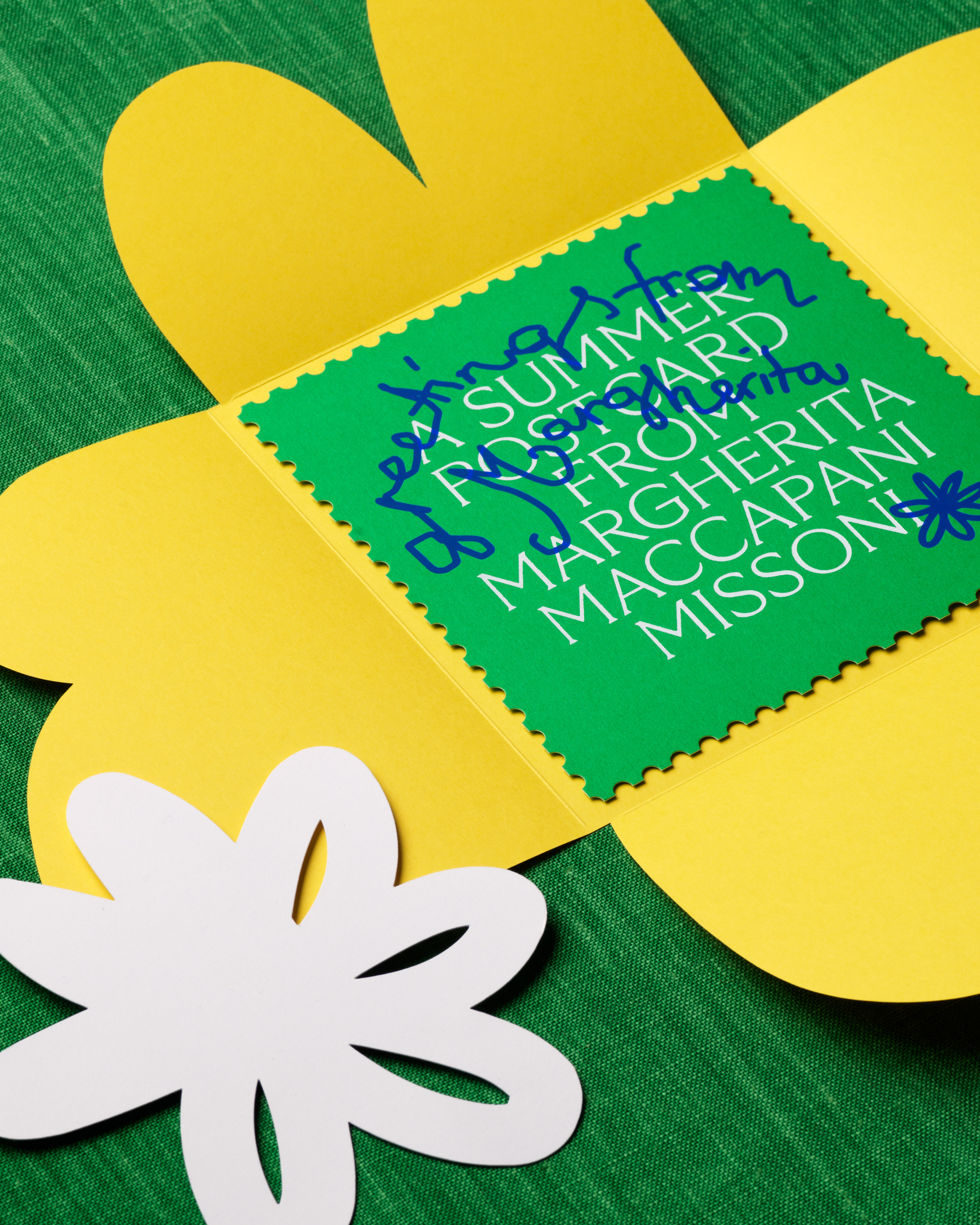 The summer invitation’s envelope was a huge flower which unfolded like a picnic blanket to present the postcard invite sprinkled with paper daisies.