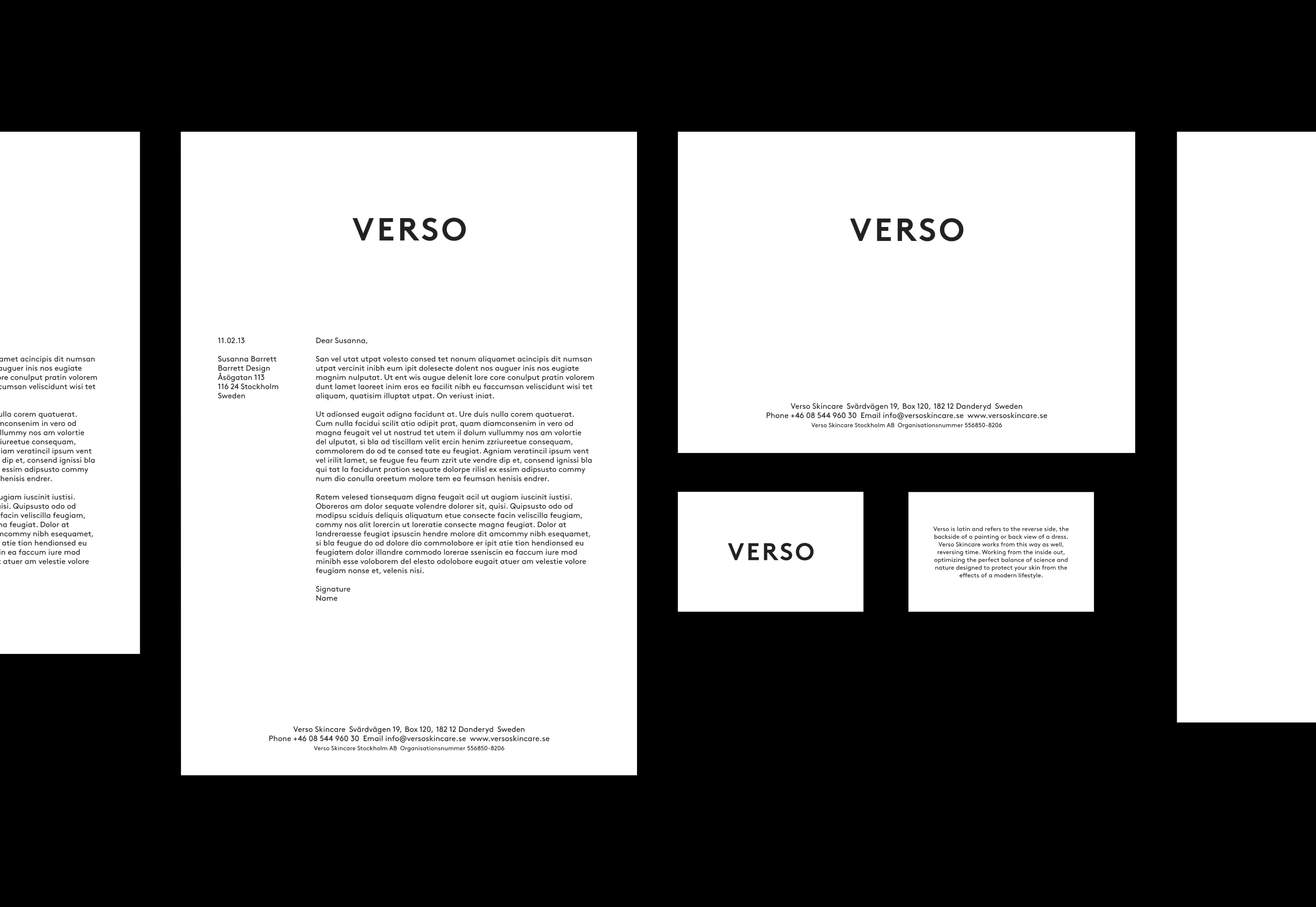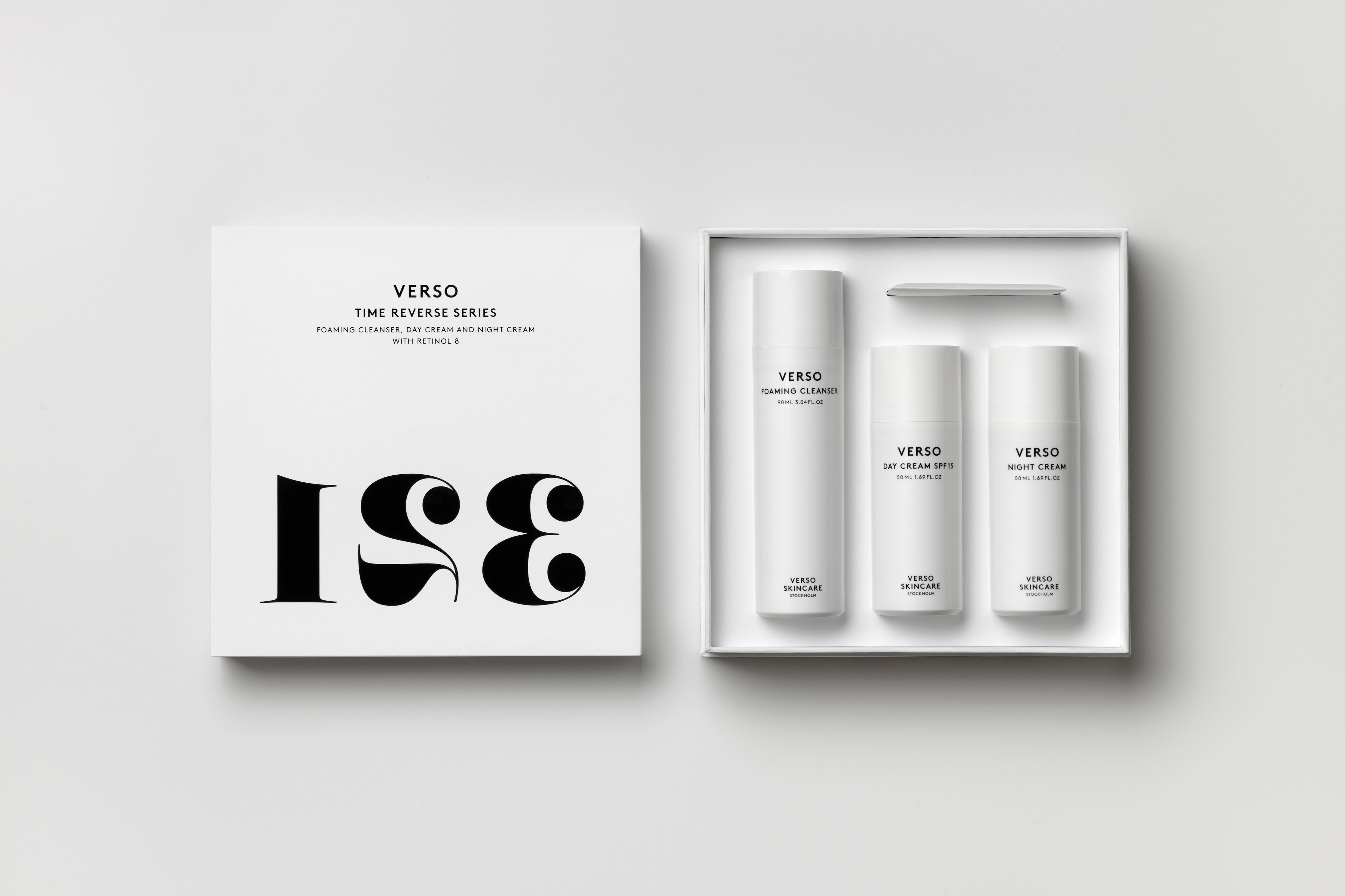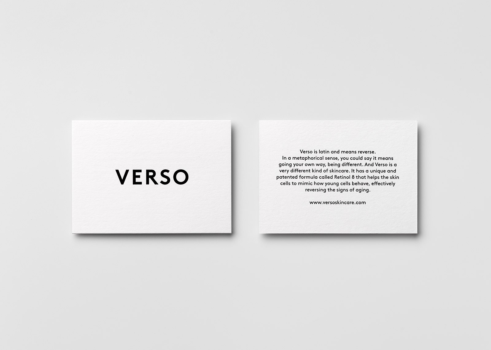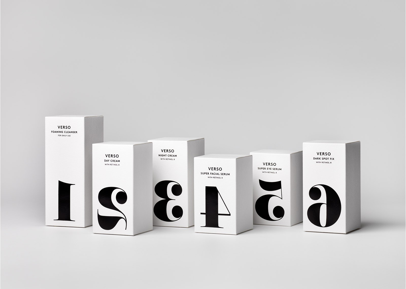 The name Verso, Latin for reverse, gave meaning to the product line and refers to the product promise of reversing signs of aging. The packaging design further expresses this idea through the mirroring of the large numerals, which also helps to differentiate the products and suggests the order of use.