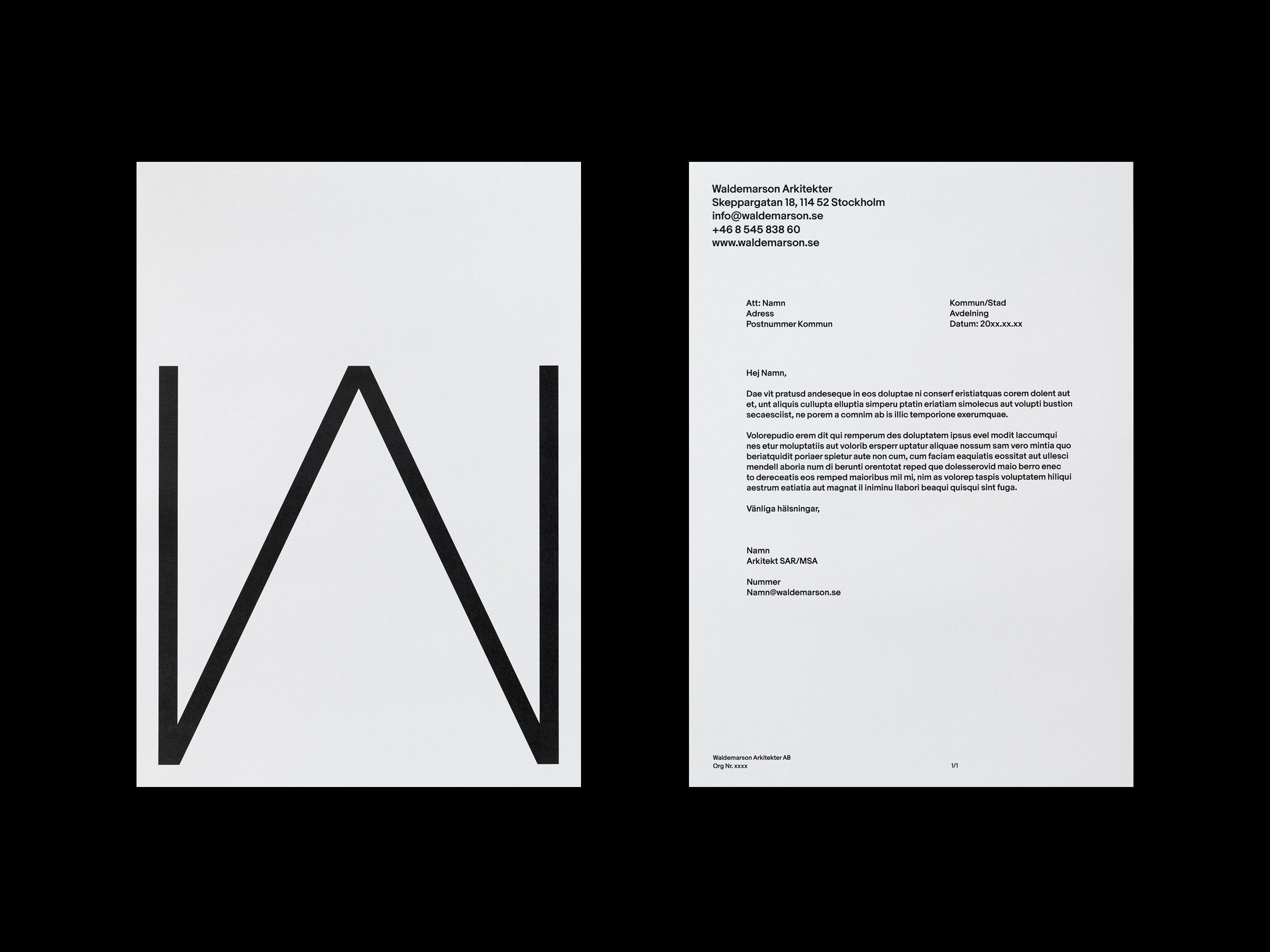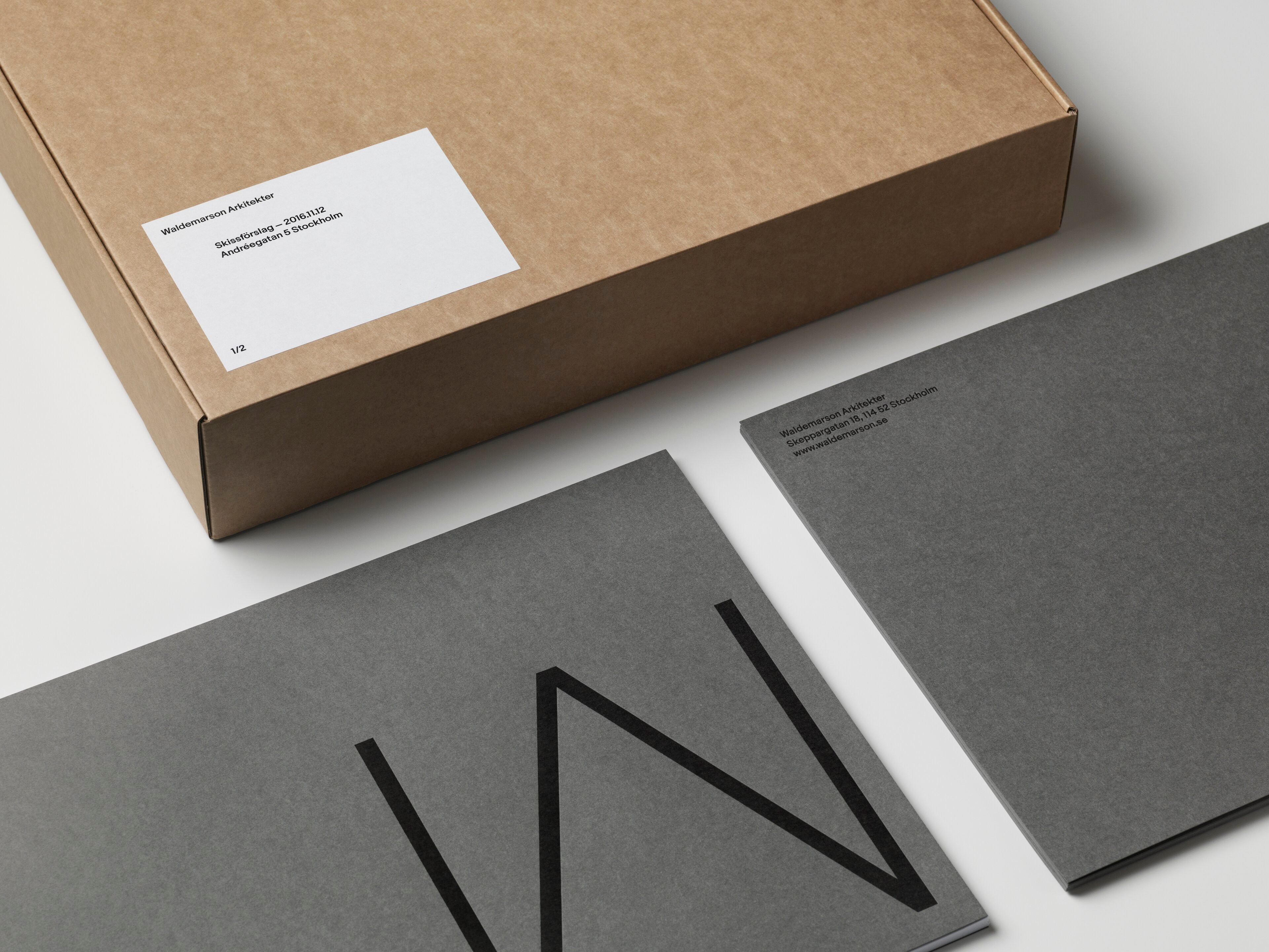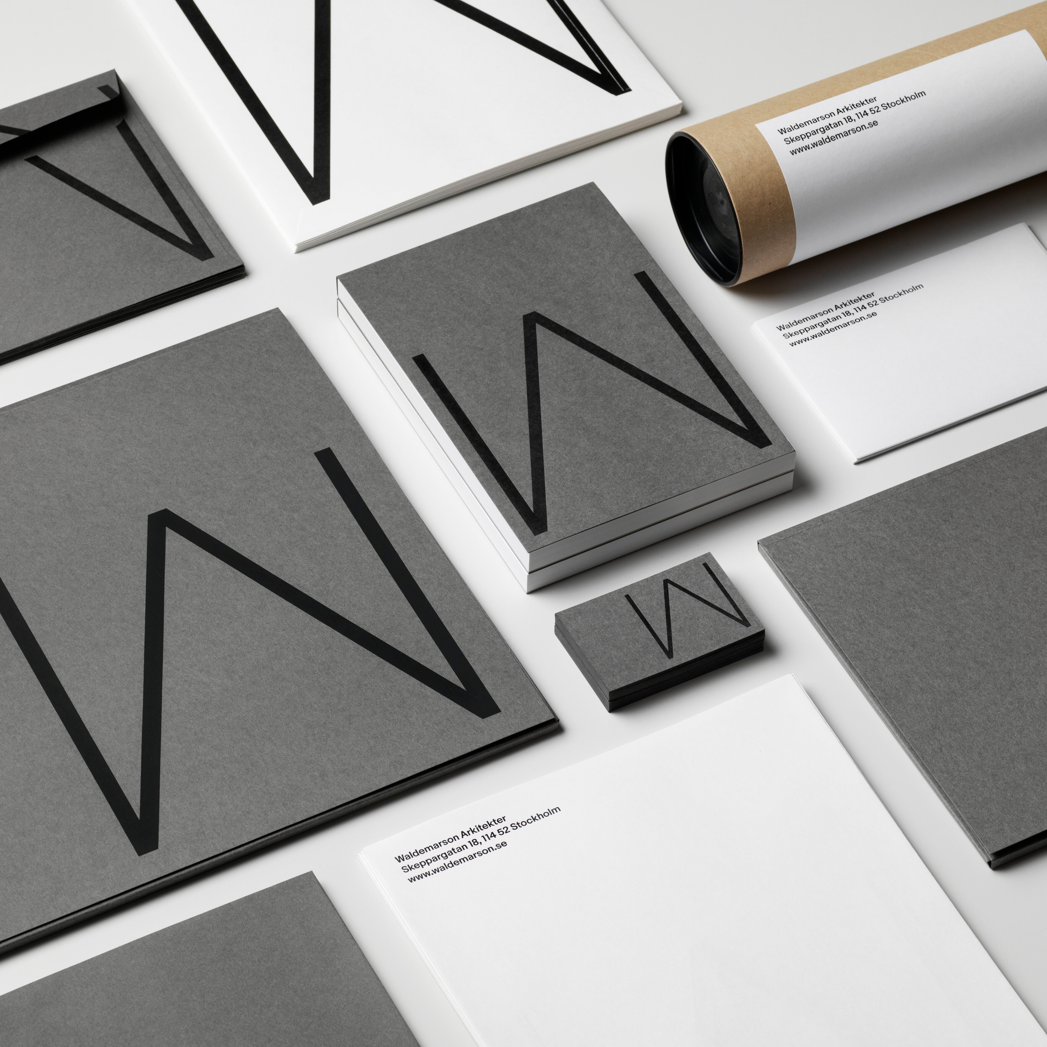 The identity for Waldemarson Arkitekter is as distinct as it is functional, a responsive design system which adapts to the proportion and purpose of each communication piece and medium. It is built to allow for consistency and ease of use through all communication. The firm’s modernist approach to architecture, with references to, for example, Mies van der Rohe, formed the basis for the visual expression.
