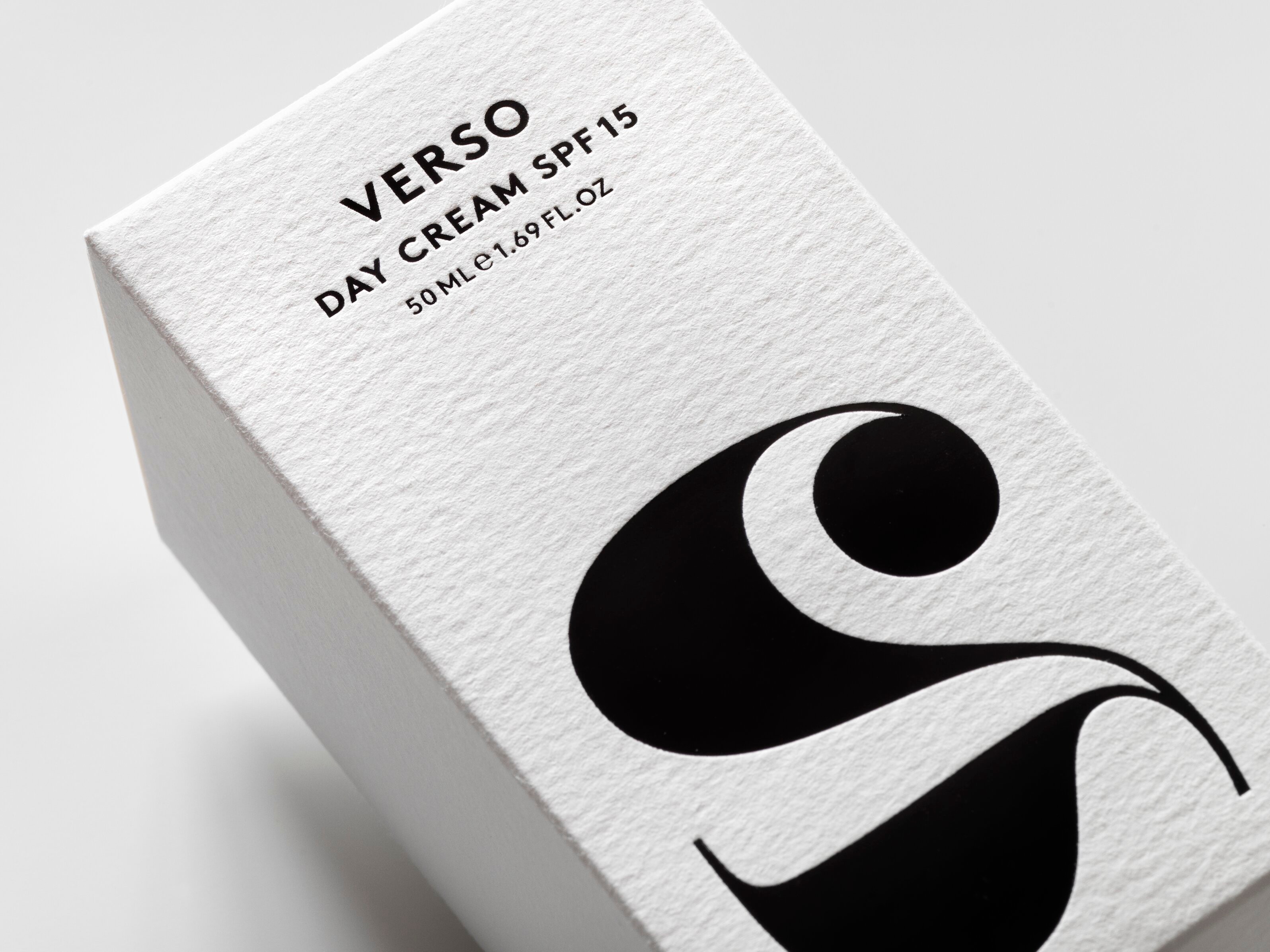 The name Verso, Latin for reverse, gave meaning to the product line and refers to the product promise of reversing signs of aging. The packaging design further expresses this idea through the mirroring of the large numerals, which also helps to differentiate the products and suggests the order of use.